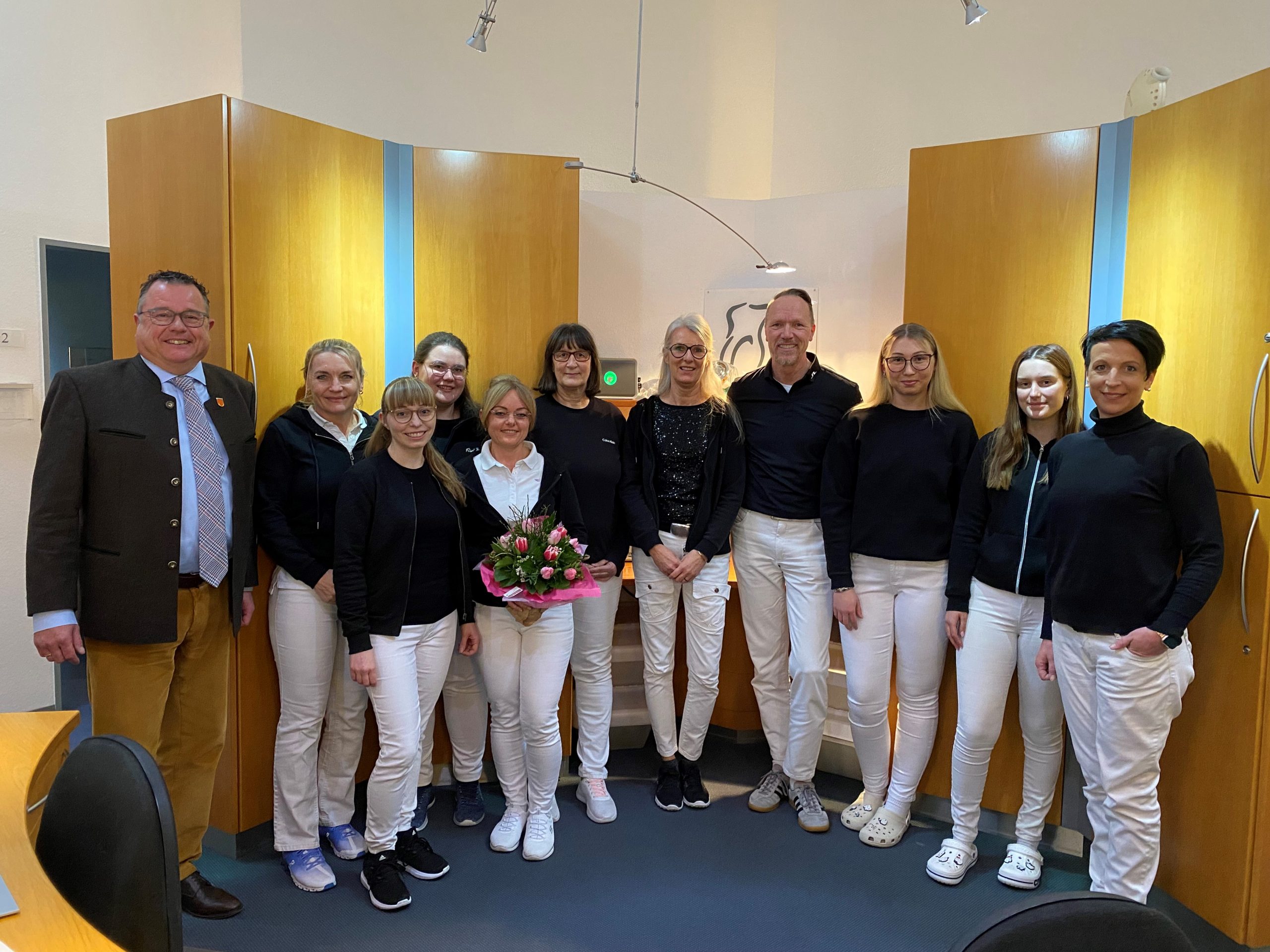 Bürgermeister Christian Thegelkamp bedankte sich bei dem Ehepaar Steinhoff und dem Praxisteam für die Einsicht in die Praxis und für das harmonische Gespräch und Beisammensein. Er überreichte einen Bildband über die Gemeinde Wadersloh sowie einen Blumenstrauß für Mitarbeiterin Olga Flaming, die am selben Tag Geburtstag feierte. „Es freut mich wirklich sehr, Sie alle kennenzulernen. Auf Sie können wir hier bei uns in Wadersloh bei der zahnmedizinischen Versorgung zählen und das schon sehr lange und mit toller Qualität“, so der Bürgermeister abschließend.